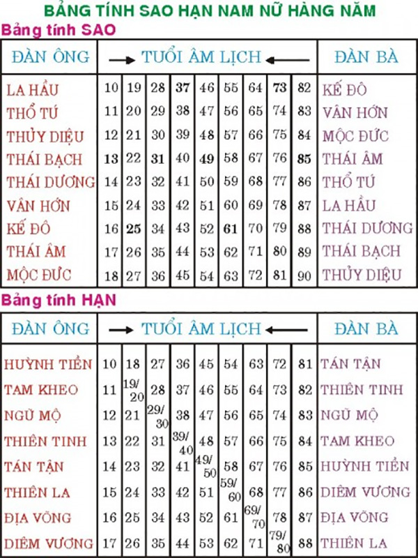 (Tìm sao ứng với hạn của các tuổi cần giải hạn nhương tinh)